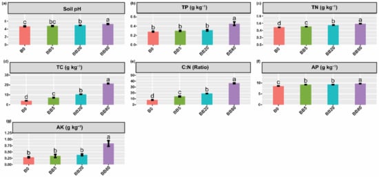 The effects of different concentration of bamboo biochar on soil physicochemical properties. (a) Soil pH, (b) Total phosphorous (TP); (c) Total nitrogen (TN); (d) Total carbon (TC); (e) C:N ratio; (f) Available phosphorous (AP); (g) Available potassium (AK). The bar graphs with different lowercase letters show a significant difference between treatments (LSD test, p < 0.05). B0, BB5, BB20, and BB80 represent different bamboo biochar concentrations of 0, 5, 20, and 80 g kg−1, respectively.