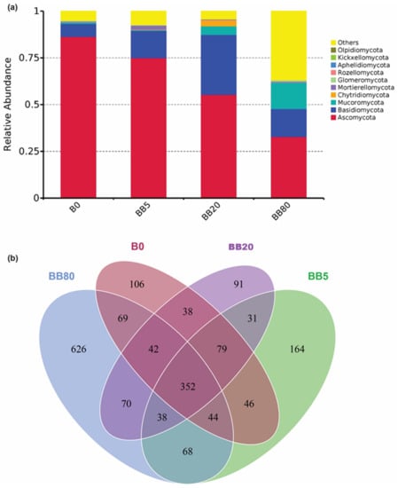The relative abundance of fungal phyla changed with BB concentration (B0, BB5, BB20, and BB80). The Ascomycota, Basidiomycota, Mucoromycota, and Chytridiomycota were dominant phyla found in all treatments. The abundance of Ascomycota decreased significantly with increasing biochar concentrations, while an opposite response was observed for Mucoromycota. We also found that the relative abundance of Basidiomycota, Chytridiomycota was higher under BB treatments compared with control (B0) (Figure 2a). Overall, these results showed that BB contributed to improving the relative abundance in the red soil of southern China. Moreover, the Ven diagram also revealed that 352 OTUs were common, suggesting a higher similarity of soil fungal communities among all treatments. However, under the highest BB concentrations (BB80), the maximum number of unique OTUs (i.e., 626) were observed (Figure 2b).