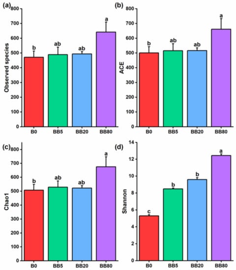 The alpha diversity of soil fungal species. The different alpha diversity indices were calculated under different bamboo biochar concentrations: (a) Observed species; (b) ACE index; (c) Chao1 index; (d) Shannon diversity index. The bar graphs with different lowercase letters show significant differences between various treatments (LSD test, p < 0.05). B0, BB5, BB20, and BB80 represent different bamboo biochar concentrations of 0, 5, 20, and 80 g kg−1, respectively.