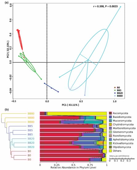 Changes in soil fungal community composition. (a) Unweighted UniFrac principal coordinate analysis (PCoA) showing differences in fungal communities; (b) Unweighted pair group method with arithmetic mean analysis (UPGMA) of fungal communities. B0, BB5, BB20, and BB80 represent different bamboo biochar concentrations of 0, 5, 20, and 80 g kg−1, respectively.