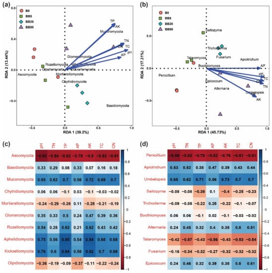 The distance-based redundancy analysis (RDA) was performed to determine the environmental factors that affected fungal structure at the phylum and genus level. RDA results suggested that soil pH, TN, TP, AK, TC, AP, and C:N explained 52.64% and 63.04% of the total shift in fungal phyla and genera, respectively. Besides, under varying biochar concentrations, soil samples were completely separated from each other (Figure 5a,b). At the phylum level, Ascomycota, Mortierellomycota, and Olpidiomycota were negatively associated with soil pH, TN, TP, AK, TC, AP, and C:N, while Basidiomycota, Mucoromycota, Glomeromycota, Rozellomycota, Aphelidiomycota, Kickxellomycota, and Planctomycetes were positively associated (Figure 5c). Furthermore, at the genus level, Penicillium, Saitozyma, Trichoderma, Boothiomyces, Talaromyces, and Fusarium were negatively associated with soil pH, TN, TP, AK, TC, AP, and C:N, while Apiotrichum, Umbelopsis, Alternaria, and Epicoccum were positively associated (Figure 5d). Moreover, we also found that soil physicochemical properties including pH, TN, TP, AK, TC, AP, and C:N had a significant effect on soil fungal community composition (Table 1).