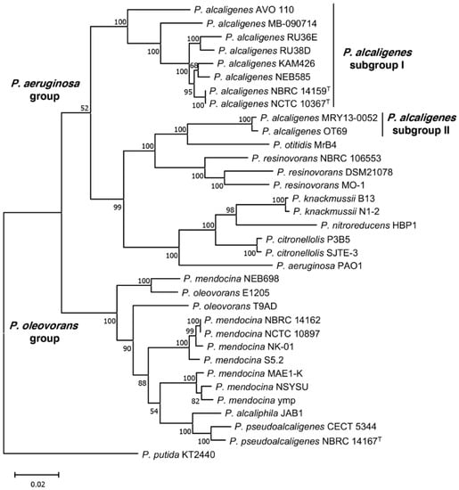 To further study the inclusion of AVO110 in the species P. alcaligenes, we analyzed the core genome phylogeny of this strain and 34 other pseudomonads belonging to the P. aeruginosa and P. oleovorans groups, including, among others, P. alcaligenes and P. pseudoalcaligenes, respectively [,]. The tree was rooted using the genome of P. putida KT2440 as an outgroup. The genome sequence of P. alcaligenes Bin_52_1, which is fragmented into a large number of scaffolds (Table 2), was not included in this analysis or in the comparative genomic analysis described below. The phylogeny showed separation of the strains into two monophyletic branches corresponding to the P. aeruginosa and P. oleovorans groups. All P. alcaligenes strains were included in the P. aeruginosa group. However, while P. alcaligenes AVO110 grouped in a monophyletic branch with the P. alcaligenes strain NBRC 14159 (NCTC 10367) and all other P. alcaligenes strains isolated from water samples (P. alcaligenes subgroup I), P. alcaligenes strains isolated from blood and oyster infections were included in a different sub-branch of the tree (P. alcaligenes subgroup II) together with P. otitidis and P. resinovorans (Table 2). The P. pseudoalcaligenes strains analyzed were both included in the P. oleovorans group, which also included P. mendocina strains and P. alcaliphila JAB1 (Figure 1).