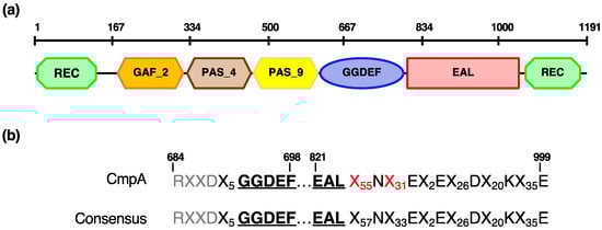 (a) Distribution of functional domains present in CmpA protein; (b) conservation of GGDEF and EAL domains. Numbers indicate positions of amino acid residues from first methionine. Residues corresponding to RXXD motif, responsible for allosteric control and present in other proteins that contain GGDEF domains, are indicated in gray.