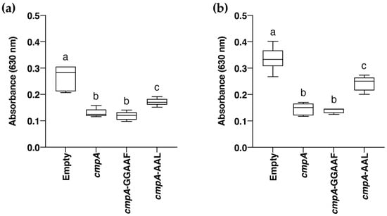 Biofilm formation by P. putida KT2440 overexpressing the wild-type cmpA gene from P. alcaligenes AVO110 or its mutated alleles, cmpA-GGAAF and cmpA-AAL, was carried out as previously described [,]. P. putida KT2440 was transformed by electroporation [] with pAMEX (empty vector), pAMEX-cmpA, pAMEX-cmpA-GGAAF, or pAMEX-cmpA-AAL (Table 1). Transformants were grown overnight in LB-Km medium at 25 °C. The cultures were prediluted in LB to an OD600 of 0.1 and subjected to six 10-fold serial dilutions. Samples (150 µL) of the diluted suspensions were deposited in the wells of a microtiter dish, and the plates were incubated for 20 h at 25 °C with moderate shaking (150 rpm). Wells were subsequently emptied by inverting the plates onto filter paper and washed 3 times by soaking the plates in water. The plates were dried on filter paper and the attached biofilms were stained for 15 min with 200 μL of 0.1% crystal violet. The wells were emptied and again washed 3 times to remove unbound dye. Finally, the wells were filled with 200 μL of 96% ethanol and the plates were incubated for 20 min at room temperature with vigorous shaking (600 rpm). Biofilm growth was determined from the A630 reading using a plate reader (FL600 Fluorescence Microplate Reader; Bio-Tek, Winooski, VT, USA).