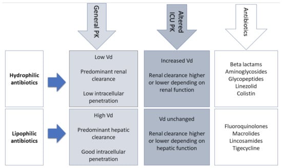 The physicochemical properties of AM should also integrate the choice of appropriate dosing (Figure 1). According to their physicochemical properties, AM are categorized as hydrophilic (aminoglycosides, β-lactams, and glycopeptides) and lipophilic (fluoroquinolones, macrolides, lincosamides) [12,14]. Hydrophilic AM are characterized by tissue distribution limited to the extracellular space with the majority depending on renal clearance. However, lipophilic AM have an intracellular accumulation and depend on hepatic clearance. Consequently, hydrophilic, more so than lipophilic drugs, are significantly affected by the PK alterations of critical illness, especially in cases of sepsis in which renal function fluctuations and Vd expansion, due to capillary leakage and volume resuscitation, are common [6,15]. This will determine the need for adjustments of loading and maintenance doses of hydrophilic AM in the critically ill patients [6]. Furthermore, the serum concentration of AM depends on their dosing, bioavailability, and Vd. Hydrophilic AM, having an extracellular distribution, have low Vd, while lipophilic AM have high Vd due to their rapid cellular uptake [16,17].