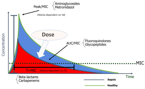 Figure 2. Pharmacokinetics and pharmacodynamics: After an antibiotic infusion, a ratio between the peak concentration and the minimal inhibitory concentration, the area under the concentration–time curve and the minimal inhibitory concentration, and the time the antibiotic concentration is above the minimal inhibitory concentration can be defined. These three parameters all decreased in septic patients, with an increased volume of distribution and clearance. The only secure way to achieve effective antibiotic concentration is to adjust the dose. MIC—minimal inhibitory concentration; T > MIC—time that the antibiotic concentration is above the minimal inhibitory concentration; Vd—Vole of distribution; Cl—Clearance.