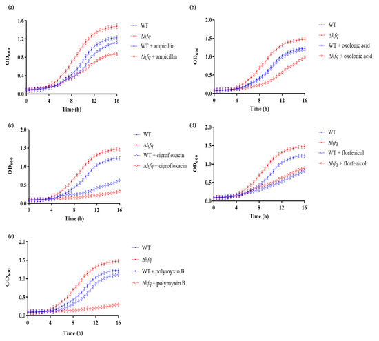 Growth curves of the WT and ∆hfq strains exposed to sublethal concentrations of antibiotics. WT and ∆hfq strains were grown in TSB medium supplemented with 0.01 mg/mL ampicillin (a), 0.0001 mg/mL oxolinic acid (b), 0.001 mg/mL ciprofloxacin (c), 0.001 mg/mL florfenicol (d) and 0.002 mg/mL polymyxin B (e). OD600 was measured every 30 min until the bacteria reached the stationary phase (16 h). Data represent the means ± standard deviations (n = 3).