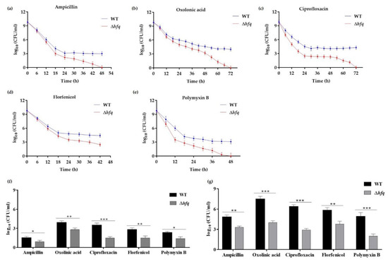 Time-kill curves and persister cells production of the WT and ∆hfq strains exposed to antibiotics. Stationary cells of the WT and Δhfq strains were exposed to 1 mg mL−1 ampicillin (a), 0.05 mg mL−1 oxolinic acid (b), 0.05 mg mL−1 ciprofloxacin (c), 0.01 mg mL−1 florfenicol (d) or 1 mg mL−1 polymyxin B (e), and the survival of persister cells was measured as CFUs per 1 mL at different time points. Exponential (f) and biofilm resuspended (g) cells of the WT and Δhfq strains were exposed to 1 mg mL−1 ampicillin, 0.05 mg mL−1 oxolinic acid, 0.05 mg mL−1 ciprofloxacin, 0.01 mg mL−1 florfenicol or 1 mg mL−1 polymyxin B for 24 h, and the survival of persister cells was measured as CFUs per 1 mL at 24 h. Asterisks represent statistical differences with respect to the wild-type strain (* p < 0.01; ** p < 0.001; *** p = 0.0001). Data represent the means ± standard deviations (n = 3).