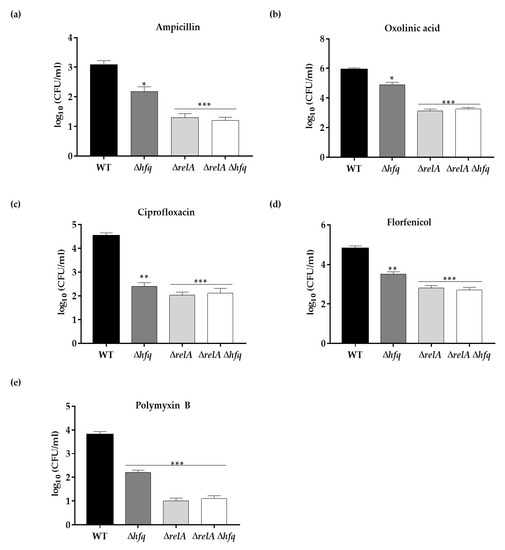 Persister cells production of the ΔrelA and ΔrelA Δhfq strains exposed to antibiotics. Stationary cells of the WT, Δhfq, ΔrelA and ΔrelA Δhfq strains were exposed to 1 mg mL−1 ampicillin (a), 0.05 mg mL−1 oxolinic acid (b), 0.05 mg mL−1 ciprofloxacin (c), 0.01 mg mL−1 florfenicol (d) or 1 mg mL−1 polymyxin B (e) for 24 h, and the survival of persister cells was measured as CFUs per 1 mL at 24 h. Asterisks represent statistical differences with respect to the wild-type strain (* p < 0.01; ** p < 0.001; *** p = 0.0001). Data represent the means ± standard deviations (n = 3).