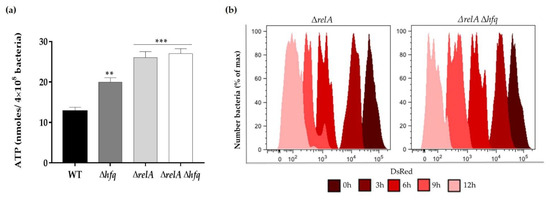 Bacterial replication and metabolic status of the ΔrelA and ΔrelA Δhfq strains. (a) WT, Δhfq, ΔrelA and ΔrelA Δhfq strains were grown in TSB to OD600 of 0.9 and the intracellular ATP levels were determined. Asterisks represent statistical differences with respect to the WT strain (** p < 0.001; *** p = 0.0001). Data represent the means ± standard deviations (n = 3). (b) Flow cytometric detection of DsRed and EGFP fluorescence at different time points from the ΔrelA and ΔrelA Δhfq strains (carrying pDiGc plasmid) cultured in TSB medium for 12 h (n = 30,000 events analyzed at each time point).
