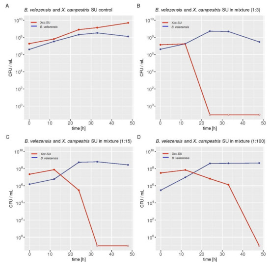 Xcc-SU dying rates in dual cultures with B. velezensis FZB42 grown in liquid medium. The ratios of B. velezensis to X. campestris SU at the time of inoculation was 1:3 (B), 1:15 (C), and 1:100 (D) in CFU/mL. (A) Representative growth curves of both microorganisms in control monocultures. The individual values in the graphs show the arithmetic means of CFU/mL measured at a given time in two independent cultures. The open dots in the Xcc plots indicate that no living Xcc bacteria were detected in the dual culture. R Core Team (2021) [46] free software environment for statistical computing and graphics was used for graphical presentation of the data. B. velezensis FZB42, blue line; Xcc-SU, red line.