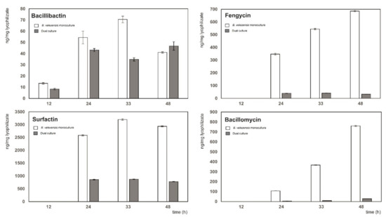 In addition to the qualitative analysis of the cell-free extracts of dual cultures, a quantitative analysis of individual metabolites was performed. The quantity of lipopeptides (ng per mg of lyophilized supernatant) measured in the monoculture of B. velezensis FZB42 was much higher than those in the dual culture except for the siderophore bacillibactin, where the maximum content in both cultures was comparable. The maximum amount of bacillibactin, surfactin, and fengycin in the dual culture was achieved in 24 h, whereas bacillomycin increased during cultivation up to 48 h (Figure 3). In the monoculture of B. velezensis FZB42, the maximum contents of surfactin (3198 ± 30 ng/mg) and bacillibactin (70 ± 3 ng/mg) were reached at 33 h, whereas those of fengycin (685 ± 5 ng/mg) and bacillomycin (760 ± 6 ng/mg) at 48 h. The maximum amounts of bacillibactin, surfactin, fengycin, and bacillomycin detected in the dual culture were about 1.4, 3.8, 14.0, and 26.7 times lower (Figure 3).