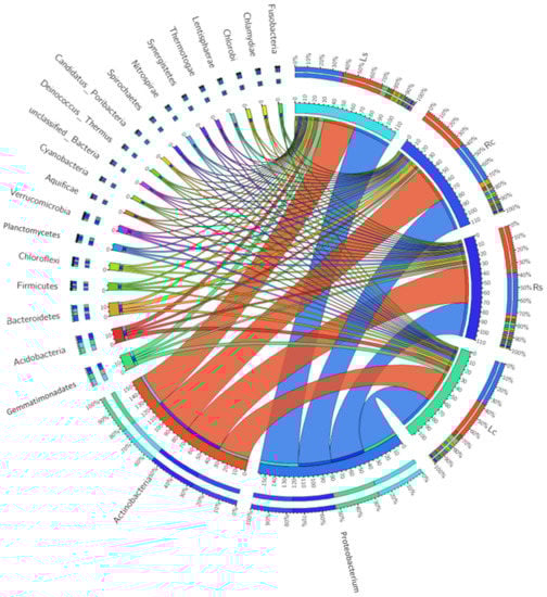 The relative abundance of bacterial phyla in maize rhizosphere and the bulk soils. Ls—Lichtenburg rhizosphere sample, Lc—Lichtenburg bulk (control) sample, Rs—Randfontein rhizosphere sample, Rc—Randfontein bulk (control) sample. In the circus plot, the maize rhizosphere and bulk samples were arranged radially and the percentages of each phylum represented with color chords linking them together. For example, the color chords of Proteobacteria and Actinobacteria were larger than other phyla and their percentages can be viewed at the edge of each sampling sites and controls.