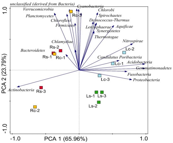 Principal component analysis (PCA) of bacterial metagenomes. The length of each vector represents the influence of the bacterial group metagenomes on the environment. Ls-1–3 (replicates of rhizosphere soil samples collected from Lichtenburg site), Lc-1–3 (replicates of bulk soil samples collected from Lichtenburg site), Rs-1–3 (replicates of rhizosphere soil samples collected from Randfontein site), Rc-1–3 (replicates of bulk samples collected from Randfontein site). The length of vectors shows the strength of influence of each phylum in the soil (e.g., Verrucomicrobia, Planctomycetes, Cyanobacteria and unclassified bacteria had most influence on Rs-1, Rs-2, Rc-1 and Rc-3; Chlorobi, Nitrospirae, Cyanobacteria, Acidobacteria and Gemmatimonadetes had most influence on Lc-1–3; Proteobacteria, Gemmatimonadetes and Acidobacteria had most influence on Ls-1–3 while Actinobacteria had most influence on Rc-2 and Rs-3). Coordinate axis 1 (65.96%) and 2 (23.79%) explain variation in the sampling sites.