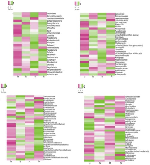 Heatmap of maize rhizosphere bacterial community: Class (a), Order (b) Family (c) and Genus (d). The color saturation (z-score) represents the relative abundance of three replicates deduced from the maize rhizosphere (Ls and Rs) and bulk (Lc and Rc) soils. All statistical analyses, including mean values and analysis of variance (ANOVA) were done using GraphPad Prism (v5.0) as shown in Table S1.