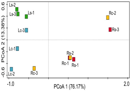 Principal coordinate analysis (PCoA) plot of rhizosphere bacterial communities across sampling sites using Bray-Curtis dissimilarities. Coordinate axis 1 (76.17%) and 2 (13.38%) explain separation in the sampling sites. Ls-1–3 triplicate rhizosphere soil from Lichtenburg site, Lc-1–3 triplicate bulk (control) soil from Lichtenburg site, Rs-1–3 triplicate rhizosphere soil from Randfontein site, Rc-1–3 triplicate bulk (control) soil from Randfontein site.