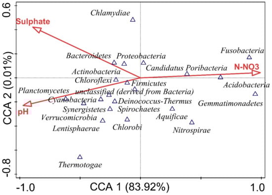 The canonical correspondence analysis (CCA) showed the relationship between the relative abundance of bacterial communities and assessed environmental variables (Figure 5). The vector length of the physicochemical parameters (N-NO3, sulfate, and pH) revealed that the parameters considerably influence the community structure of bacteria across the sampling sites. The N-NO3 of samples significantly (p = 0.019) contributed 82.70% of the variation, sulfate insignificantly (p = 0.50) contributed 9.70% variation while pH insignificantly (p = 1.00) contributed 7.60% variation in the bacterial community (Table 3). As illustrated by CCA, N-NO3 remains the most influential soil factor shaping the structural diversity of bacteria in our sampling sites. Although the significance of pH on bacterial structure has been reported in several studies [61,62], because the pH of our sampling sites was within the considerable range required for bacterial inhabitation, it led to its negligible contribution to the community structure of bacteria of the sampling sites [18].