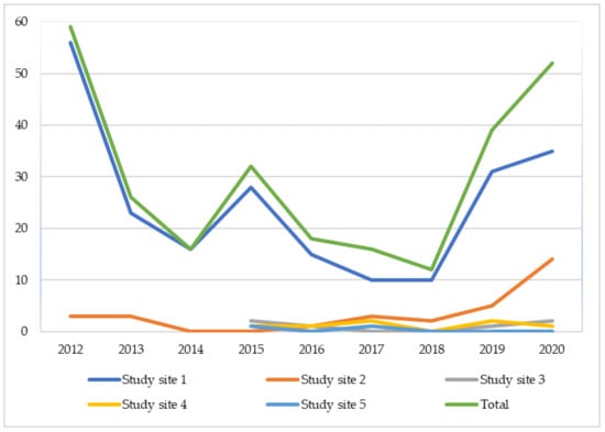 Counts of Dactylorhiza incarnata subsp. ochroleuca recorded over nine years in England in five study sites.