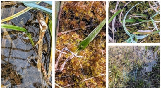 Seedlings of all sizes, either submerged or not submerged at the time of planting, survived over the winter of 2020–2021 (Figure 6). After seven months of planting 42% of seedlings showing growth after the winter months. Seedlings were not observed in areas where the water level is more than 10 cm in depth. Seedlings were visible in association with seasonally emerging vegetation characteristic of the reintroduction target area, typified by Carex elata, Schoenus nigricans, Phragmites australis, Eleocharis quinqueflora and Juncus subnodulosus, mosses Campylium stellatum and Calliergonella cuspidata and, in inundated areas, the stoneworts Chara vulgaris, C. aculeolata, and C. hispida.