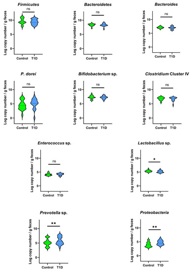 Violin plots reporting the qPCR quantification of fecal bacterial groups in T1D and control children (n = 17 participants per group). p-values were computed using the Mann–Whitney U test, * p < 0.05, ** p < 0.001, ns—not significant.