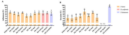 (A) Adherence and (B) invasion ability (%) of the Bacteroides species tested with HT29-MTX-E12 cell line. Bars with the same lowercase letter are not statistically different (p > 0.05). N.I.—non-invasion.