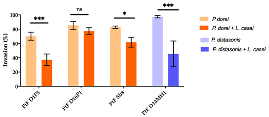 Effect of the presence of Lactobacillus casei DSM 20011 on the invasion ability (%) of P. dorei strains (P. dorei + L. casei) and P. distasonis (P. distasonis + L. casei). * p < 0.05; *** p < 0.001, ns—not significant.