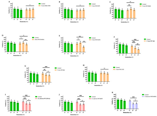 Viability of the HT29-MTX-E12 cells exposed to 10%, 25% and 50% of the secretome of the culture of P. dorei DSM 17855 (A), P. dorei PtFD1P5 (B), P. dorei PtFD8M1 (C), P. dorei PtFD16M14 (D), P. dorei PtFD16P1 (E), P. dorei PtFSb6 (F), P. dorei PtFSb8 (G), P. dorei PtFC1P2 (H), B. uniformis PtFD3Pch2 (I), B. uniformis PtFSb3P5 (J), P. distasonis PtFD14MH1 (K). The addition of BHI to cell culture at the tested concentrations was used as control. Bars with the same letter are not statistically different when compared to control (p > 0.05). Data statistically different for each strain are represented by ** p < 0.01; *** p < 0.001.