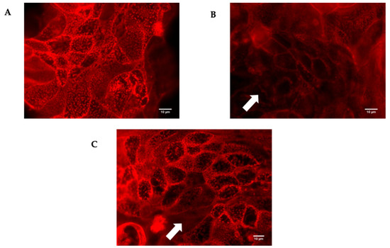 The capacity of P. dorei, B. uniformis and P. distasonis strains to cause alterations to the epithelial integrity of the cell line HT29-MTX-E12 was evaluated as previously described in [50] with slight modifications. The cells were seeded in wells containing a sterile coverslip, Ø 13 and 1.5 mm thickness (VWR, Radnor, Philadelphia, PA, USA). Bacterial suspensions at a concentration of 107 CFU/mL were transferred to the epithelial intestinal cells after the differentiation period of 21 days. The cell line was exposed to the bacterial cells during 4 h at 37 °C under anaerobic conditions. The infected cells were then washed with PBS 3 times and fixed with 3.7% (v/v) formaldehyde (Labscan Analytical Sciences, Gliwice, Poland) for 15 min. Three new washing steps with PBS were performed. The cell line was then permeabilized with 0.5% Triton X-100 (Merk, Darmstadt, Germany) for 10 min, followed by 3 washing steps with PBS. The cells were then blocked for non-specific binding with 3% (w/v) bovine serum albumin (Merk, Germany) at 4 °C for 1 h. Thereafter the cells were incubated during 20 min with tetramethylrhodamine B isothiocyanate-phalloidin (TRITC-phalloidin) (Sigma-Aldrich, Hamburg, Germany) (diluted 1:200 from an initial solution of 0.1 mg/mL). Afterwards the cell line was exposed for 3 min to 4′,6′-diamidine-2-phenylindole (DAPI) (Sigma-Aldrich, Germany) (diluted 1:200 of an initial solution of 14.3 mM). Two final washes were carried out with PBS. The assays were performed using three biological and two technical replicates.