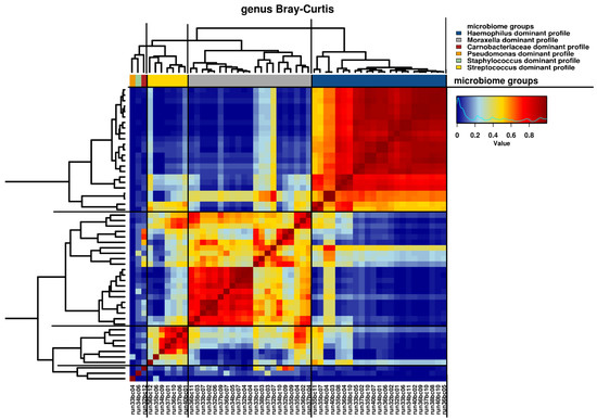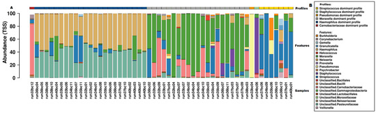 Relative abundance of microbiota read counts at genus and family levels are presented in Table S3. Given the explorative nature of this study, we used several analyses to define microbiome profiles. First, hierarchical clustering revealed six clusters that were obtained using the visual representation of the Bray–Curtis distance presented in the dendrogram and heatmap in Figure 1. The clusters were named as genus dominant microbiome profiles, based on the most abundant taxa on genus level within the cluster, as visualized in Figure 2. The Haemophilus-dominant profile was the most common (42.7%), followed by the Moraxella-dominant profile (38.9%) and the Streptococcus-dominant profile (13.0%). Three samples were deemed outliers because they were distinctly dissimilar to any of the other samples (see Figure 1). A non-metric multi-dimensional scaling (NMDS) plot, in which the previously mentioned profiles are visualized, showed distinct multidimensional distances between the different genus-dominant profiles (Figure S2). The relative abundance of the 20 top genera in each sample is presented in Figure 2. A single genus or family dominated most samples. However, within the Moraxella-dominant profile, there was relatively high abundance of Carnobacteriaceae. At sequence read level (reads that could be assigned to species level), both richness and diversity (Shannon index) were significantly lower in Haemophilus compared to Moraxella-dominant profiles (Figure S3).