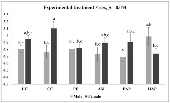 Interaction between experimental treatment and sex on Bacteroides spp. loads on d 16 in ileal content. UC, unchallenged control; CC, challenged control; PE, plant extract; AM, antimicrobial (narasin and nicarbazin; 50 ppm each active compound); FAP, full dose of AM plus PE; HAP, half dose of AM plus PE. Challenged birds were orally gavaged with Eimeria spp. on d 9 and Clostridium perfringens on d 14. a–c Mean values with no common superscripts differ significantly (p < 0.05).