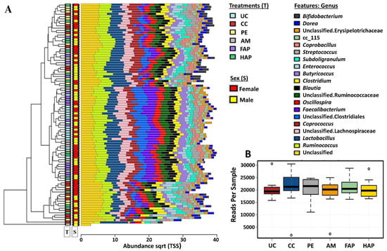 Microbial community composition on d 16 (A) Clustered barchart showing 20 most abundant genera and (B) Sequence reads per sample. UC, unchallenged control; CC, challenged control; PE, plant extract; AM, antimicrobial (narasin and nicarbazin; 50 ppm each active compound); FAP, full dose of AM plus PE; HAP, half dose of AM plus PE. ° The circle in B shows the reads of the individual sample.