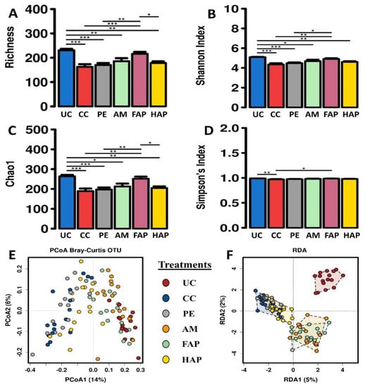Diversity of microbiota in the caecal content on d 16 showing alpha diversity indicesindices (A) Richness (p = 7 × 10−7), (B) Shannon Index (p = 4.5 × 10−6), (C) Chao1 (p = 4.5 × 10−6) and (D) Simpson’s Index (p < 0.001), and beta diversity (E) Principal coordinate analysis and (F) Redundancy analysis (p < 0.001) at OTU level. UC, unchallenged control; CC, challenged control; PE, plant extract; AM, antimicrobial (narasin and nicarbazin; 50 ppm each active compound); FAP, full dose of AM plus PE; HAP, half dose of AM plus PE. * (p < 0.05),** (p < 0.01) and *** (p < 0.001).