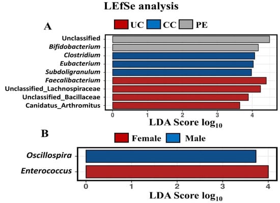 The microbiota community differences at the genus level were compared in different treatment groups as well as male and female birds using the linear discriminant analysis (LDA) effect size method (LEfSe, Figure 4A,B). The LEfSe analysis identified that the UC group was characterised with Faecalibacteria, unclassified Lachnospiraceae, unclassified Bacillaceae and Candidatus Arthromitus. The CC group was characterised with Clostridium, Eubacterium and Subdoligranulum. The PE group was identified to have the most abundance of unclassified and Bifidobacterium among all the groups. The male birds were characterised with Oscillospira and the female birds were characterised with Enterococcus.