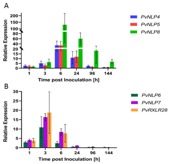 Expression of PvNLP during infection of Vitis vinifera cv. Mueller-Thurgau leaf cells: (A) Relative expression of PvNLP4, PvNLP5 and PvNLP8. (B) Relative expression of PvNLP6, PvNLP7 and PvRXLR28. The displayed graphs represent one of four experiments with similar results. Bars are the mean of four technical replicates ± standard deviation (SD).