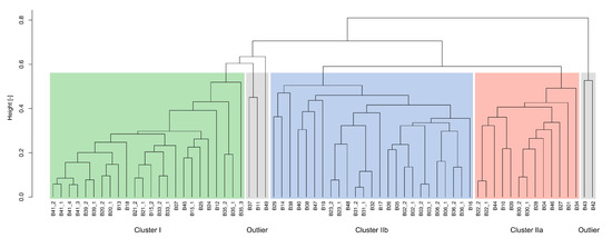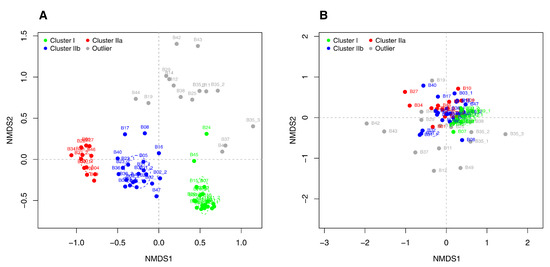 Subsequently, the defined microbiome clusters were used to visualize colored NMDS ordination plots which arrange objects, in this case the recorded taxonomic profiles, as close as possible according to their (dis)similarities. The identified clusters were coloured according to the defined clusters of the tree diagram: Cluster I in green, cluster IIa in red, cluster IIb in blue and the outliers in grey (Figure S2). Many of the investigated samples were assigned to one of the specific microbiome clusters I, IIa and IIb based on the calculated McQuitty (dis)similarity matrix visualized as tree diagram (Figure 3). However, the NMDS ordination plot revealed, in addition to the outliers of the tree diagram (B11, B37, B42, B43, B49), samples which also lie outside of the identified clusters (B12, B14, B19, B25, B29, B35, B38, B44) (Figure S2). These samples will be summarized as group of outliers for the following analyses.