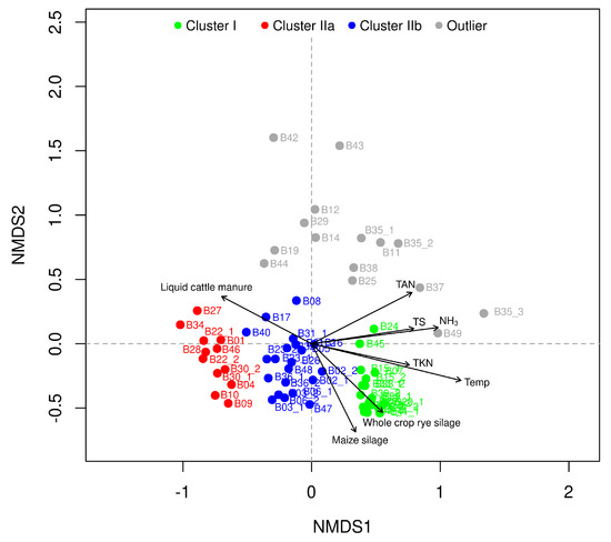 Non-metric multidimensional scaling (NMDS) based on the taxonomic diversity of the 67 analyzed digester samples from 49 agricultural, full-scale biogas plants. The color code is deduced from the tree diagram in Figure 3: Cluster I = green, cluster IIa = red, cluster IIb = blue, outlier = gray. The given environmental vectors symbolize the amount of maize silage (R = 0.30, p = 0.001), whole crop rye silage (R = 0.30, p = 0.001), liquid cattle manure (R = 0.32, p = 0.001), the process temperature (R = 0.74, p = 0.001), total solids (TS) (R = 0.33, p = 0.001), the total ammonium nitrogen (TAN) (R = 0.40, p = 0.001), the total Kjeldahl nitrogen (TKN) (R = 0.31, p = 0.001) and the free ammonia nitrogen concentration (NH) (R = 0.51, p = 0.001).