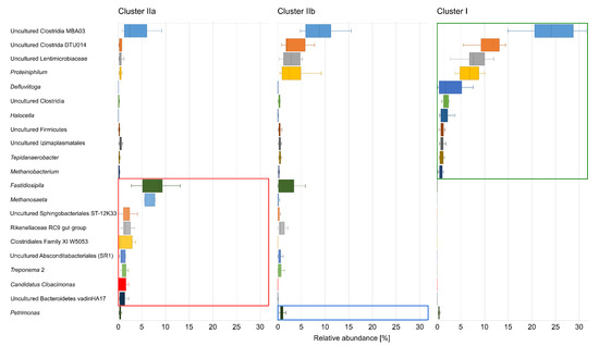 Exemplary distribution of the 21 most abundant indicative taxa and their relative abundances within the defined clusters IIa, IIb, I based on the taxonomic profiles. Indicator taxa of the respective clusters are boxed in red for cluster IIa, blue for cluster IIb and green for cluster I. Statistically significant differences were calculated using the “indicspecies” package of R with a point biserial correlation coefficient as statistic value [52,53].