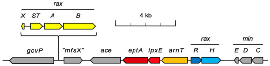 The raxX-raxSTAB gene cluster apparently has been gained and lost multiple times during Xanthomonas speciation [8]. In all cases identified [8], this cluster is located in the same genome neighborhood, between the gcvP gene encoding a subunit of glycine dehydrogenase [43] on one side, and the minCDE operon encoding proteins required for cell division [44] on the other (Figure 1). The gene denoted as “mfsX” is predicted to encode a major facilitator subfamily permease [8]. The eptA, lpxE, and arnT genes are predicted to encode enzymes involved in lipid A remodeling, as described below (Section 3.3, Section 3.4 and Section 3.5).
