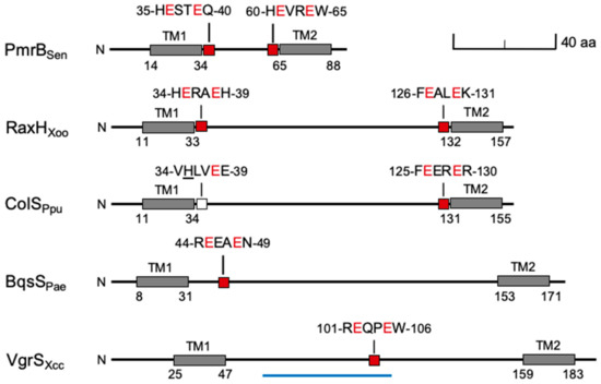 Periplasmic domain schematic structures for selected sensor proteins. Drawn to scale. The amino-terminal sequences are illustrated through the second of two transmembrane (TM) helices, shown as gray filled boxes. Numbers show positions of specific residues. The conserved ExxE motifs are shown as red-filled boxes, with the corresponding sequences above. The variant HxxE motif in ColS is shown as a white box. The blue line under the Xcc VgrS periplasmic domain shows the extent of a conserved sequence substitution in the Xoo sequence that removes the ExxE motif. Sen, Salmonella enterica LT2, Xoo, Xanthomonas oryzae pv. oryzae PXO99A, Ppu, Pseudomonas pudita KT2440, Pae, Pseudomonas aeruginosa PAO1, Xcc, Xanthomonas campestris pv. campestris 8004. See text for references.