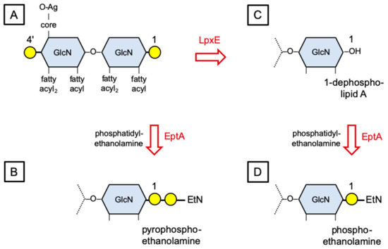 Second, this genetic association reflects functional association, as H. pylori LpxE removes the lipid A 1-phosphate before EptA adds P-EtN, thereby forming a monophosphoethanolamine (P-EtN) moiety [72] (Figure 3C,D). In many other studied genera, P-EtN is added to the existing phosphate group, thereby forming a pyrophosphoethanolamine (PP-EtN) moiety [58,60] (Figure 3B). Strikingly, lipid A from Xac is a mixture wherein some molecules contain two PP-EtN moieties and others contain one PP-EtN and one P-EtN [61], providing evidence that Xac lipid A has been dephosphorylated in some cases before P-EtN addition.