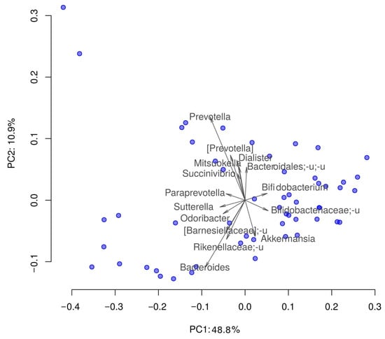 Distribution of the samples by their taxonomic composition in reduced dimensionality. PCoA (Principal Coordinate Analysis); dissimilarity metric: weighted UniFrac. Prefix “_u” denotes all unclassified taxa from the higher taxonomic rank. Arrows show the top 15 taxa in terms of the explained variance in given axes. The arrows’ length is proportional to the percent of variance explained by the taxon. The arrows’ angle reflects the distribution of this variance between the axes.