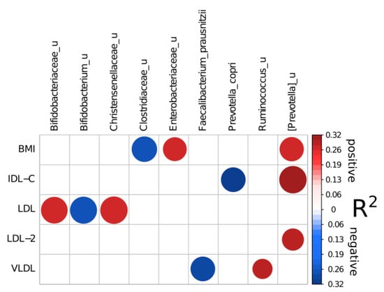 Reliable associations between microbiome composition, subfractional spectrum of apo B-containing lipoproteins and BMI according to Selbal analysis (see Section 2). Circles sizes are related to taxon reproducibility and circles colors to model R2. Numerator parts of balance are colored with red and denominator with blue.