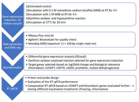 In order to achieve the objective of the study, the experimental setup was designed to include four main sections including: (i) exploration of different induction approaches to stimulate upregulation of a range of genes; (ii) identification of these genes using RNA-Seq and differentially expressed gene (DEG) analysis; (iii) selection of appropriate targets and designing RT-qPCR protocols for their relative quantification; (iv) use of these protocols to determine viability of oocysts following exposure to different chemical and physical potential inactivation treatments. The experimental setup is summarized in Figure 1.