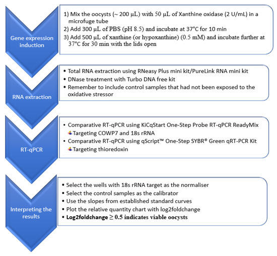 The RT-qPCR method was evaluated for its applicability in the differentiation of viable and inactivated oocysts using different inactivation treatments. The main steps of the RT-qPCR are summarized in the flow chart presented in Figure 2.