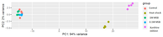 The MA plot (Figure S1) for the RNA-Seq data also showed differences in gene expression between the sample groups, indicating that MSB-treated samples and untreated control samples had similar gene expression levels, as shown by the distribution of genes around the horizontal axis. In contrast, samples subjected to heat shock or to the xanthine oxidase catalyzed reaction had clearly visible differences in gene expression levels compared with the untreated control.