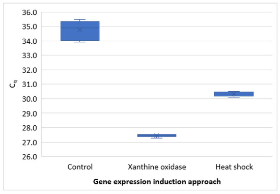 Compared with heat shock (45 °C for 20 min), the xanthine oxidase-catalyzed stressor challenge resulted in increased gene expression. Although the heat shock also induced higher gene expression than in controls, it was considerably lower than when oocysts were exposed to the oxidative stress. The difference was about 3 Cq, which amounts to approximately 8.5-fold (Figure 4).