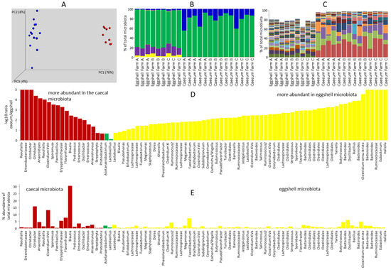 Figure 1. Comparison of eggshell microbiota and caecal microbiota of one-week old chicks. (A), weighted Principal Coordinate Analysis (PCoA) of caecal microbiota of one-week-old chickens (blue dots) and microbiota of eggshells (red dots). (B), microbiota composition of individual caecal and eggshell samples at phylum level (blue—Proteobacteria, green—Firmicutes, magenta—Bacteroidetes, yellow—Actinobacteria). Microbiota of eggshells resembled caecal microbiota of adult hens due to the presence of Bacteroidetes and Actinobacteria and low representation of Proteobacteria. (C), individual samples at OTU level (top 100 OTUs were used for figure generation) showing completely different composition of caecal microbiota of one-week-old chickens and eggshells microbiota before incubation (see Table S1 for OTU composition). (D), absolute values of log10 ratios of abundances of OTUs forming more than 0.3% of total microbiota, either in the caecum or in eggshells. Since the biological meaning of the ratios in (D) is influenced also by abundance in of each microbiota member, either in the caecal or eggshell microbiota, these are shown in (E). Abundance in caecal microbiota is shown for the OTUs more abundant in the caecum, and vice versa, abundance in eggshell microbiota is shown for the OTUs more abundant in eggshell microbiota.