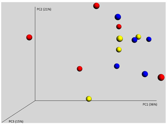 Figure 2. Weighted PCoA of caecal samples of chickens from three different parent flocks. No clustering according to origin of chickens defined by different colours was observed. Parents, therefore, did not play any role in the establishment of gut microbiota in the chickens in commercial production.