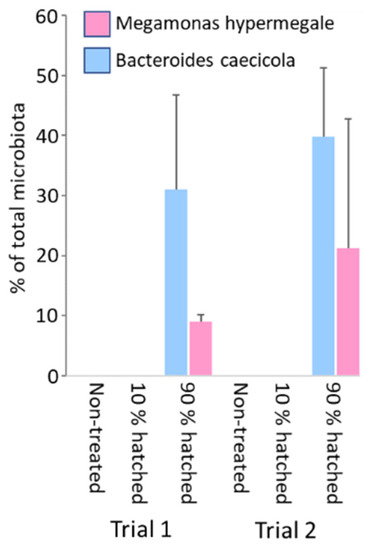 Finally, we attempted to fine the timepoint during prenatal or neonatal development at which it is possible to efficiently colonise chickens. A mixture of seven different spore-forming species was sprayed over the eggs on day 1 of embryonic development, or both on day 1 and day 20 of embryonic development. When the caecal microbiota composition was determined in one-week-old chicks, none of the strains used for egg treatment were detected in the chicken caecum (Table S3). Next, we used an additional two strains, Megamonas hypermegale and Bacteroides caecicola, which efficiently colonised the chicken caecum [12]. A mixture of these two isolates was sprayed over the box with incubated eggs on day 21 of embryonic development, either at the moment when less than 10% of chickens were already hatched, or approximately 10 h later, when 90% of chickens were hatched. No colonisation was recorded when the boxes with eggs and a few already hatched chickens were treated. In contrast, successful colonisation of all tested chickens was observed when the tray was sprayed when 90% of chickens were already hatched (Figure 5).