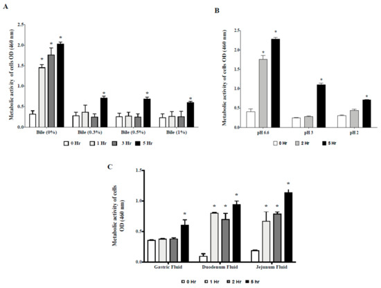 Metabolic activity and viability of CP9 cells in (A) bile environment, (B) low pH environment, and (C) swine gastro intestinal fluids. Data are presented as mean ± standard error of the mean (SEM). Bars with statistical significance denoted as * (p ≤ 0.05), using Tukey’s multiple comparison test in ANOVA. Significance in all tests is compared with the initial metabolic activity at time zero within each treatment group. The experiment was performed in triplicates and repeated thrice.
